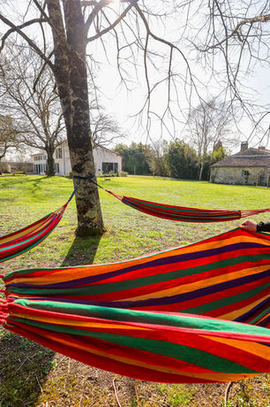 Des hamacs sont installés dans le parc, invitant à la lecture, au repos ou simplement à prendre le temps.